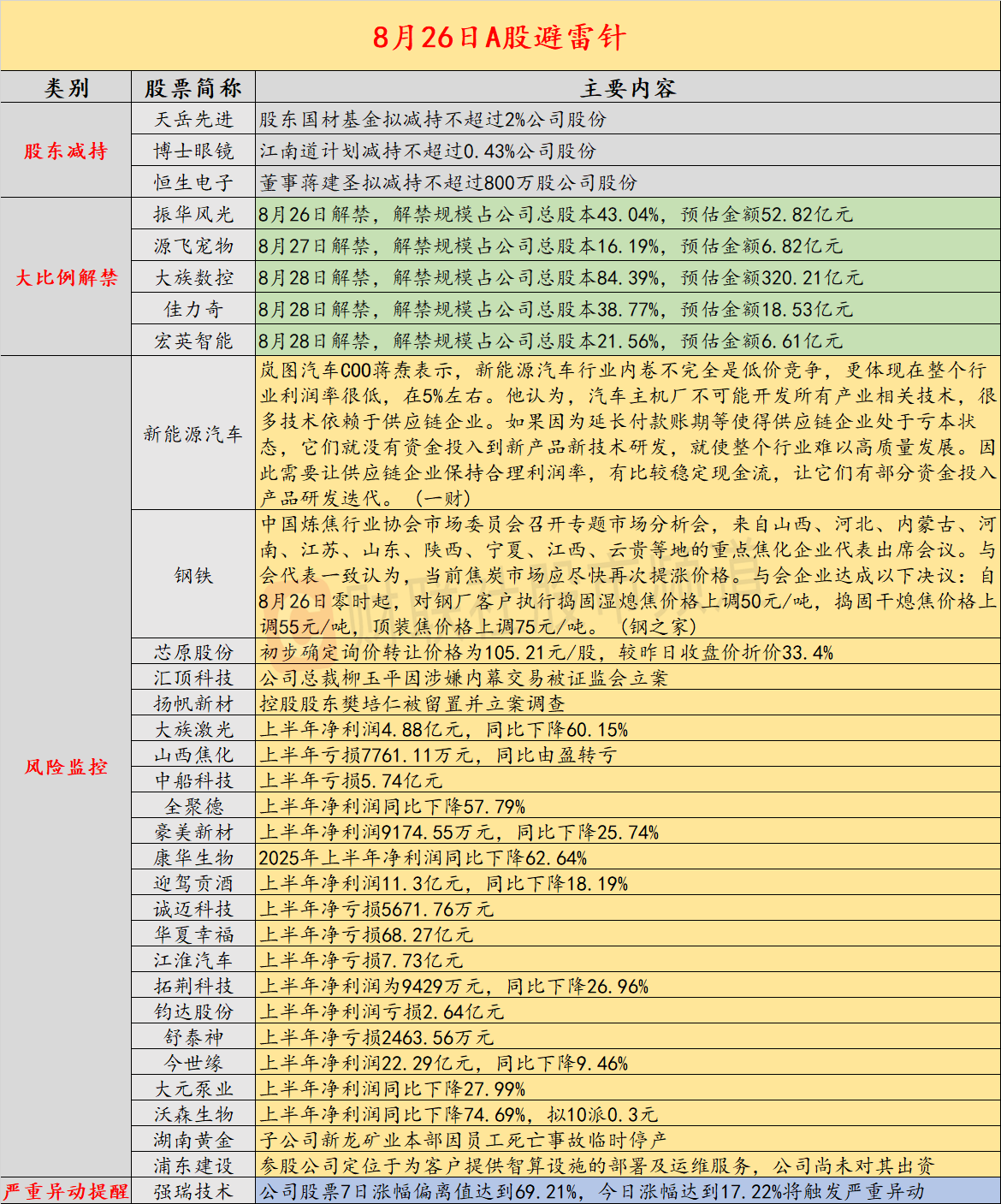 昨日公告的A股拟减持的公司数量较之前有所减少,天岳先进股东国材基金拟减持不超过2%公司股份;振华风光、大族数控将迎来超四成以上解禁;岚图高管表示,新能源汽车业内卷,行业利润率仅5%左右;芯原股份初步确定询价转让价格为105.21元/股,较昨日收盘价折价33.4%;中国炼焦行业协会与会企业对钢厂客户提涨焦炭价格;扬帆新材控股股东樊培仁被留置并立案调查;美股三大指数集体收跌,大型科技股涨跌不一。