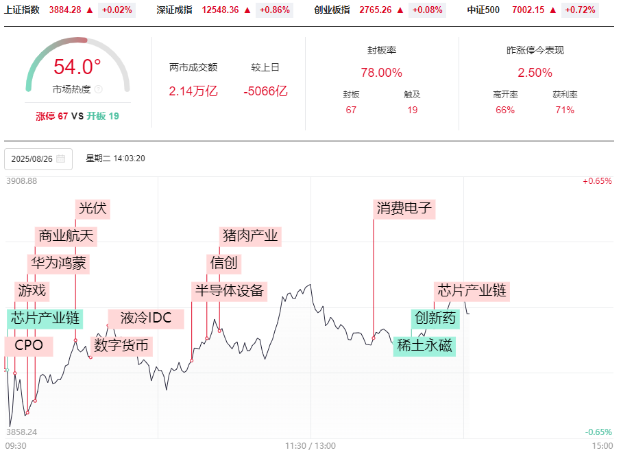 市场午后窄幅震荡,深成指领涨。成交量方面,午后第一个小时两市缩量1085亿。板块方面,午后市场热点继续轮动,消费电子方向较为强势,此外部分资金回流芯片股。短线方面,情绪重回活跃,昨日连板股仅1只下跌,连板高度升至7板。