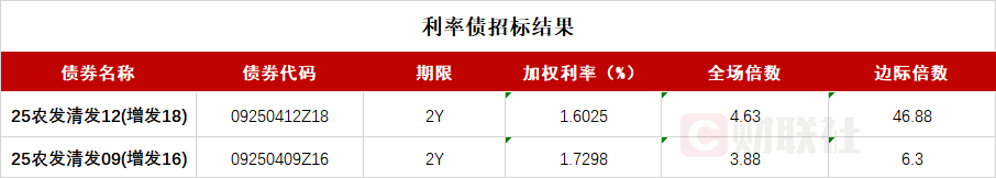 农发行两期金融债已结束招标 2年期品种25农发清发09(增发16)中标收益率1.7298%