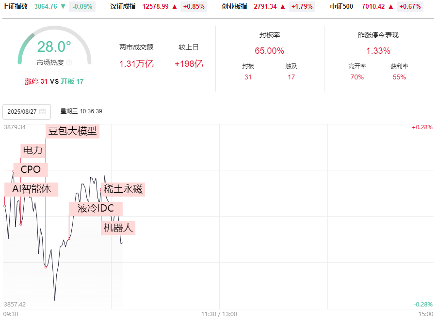 市场早盘震荡走强,创业板指领涨。创业板大小指数明显分化,权重股大涨。成交量方面,第一个小时两市放量128亿元。板块方面,资金早盘持续流入AI硬件方向,新易盛等多股再创历史新高。除了AI方向外,其余大部分板块都难有表现,个股普跌。