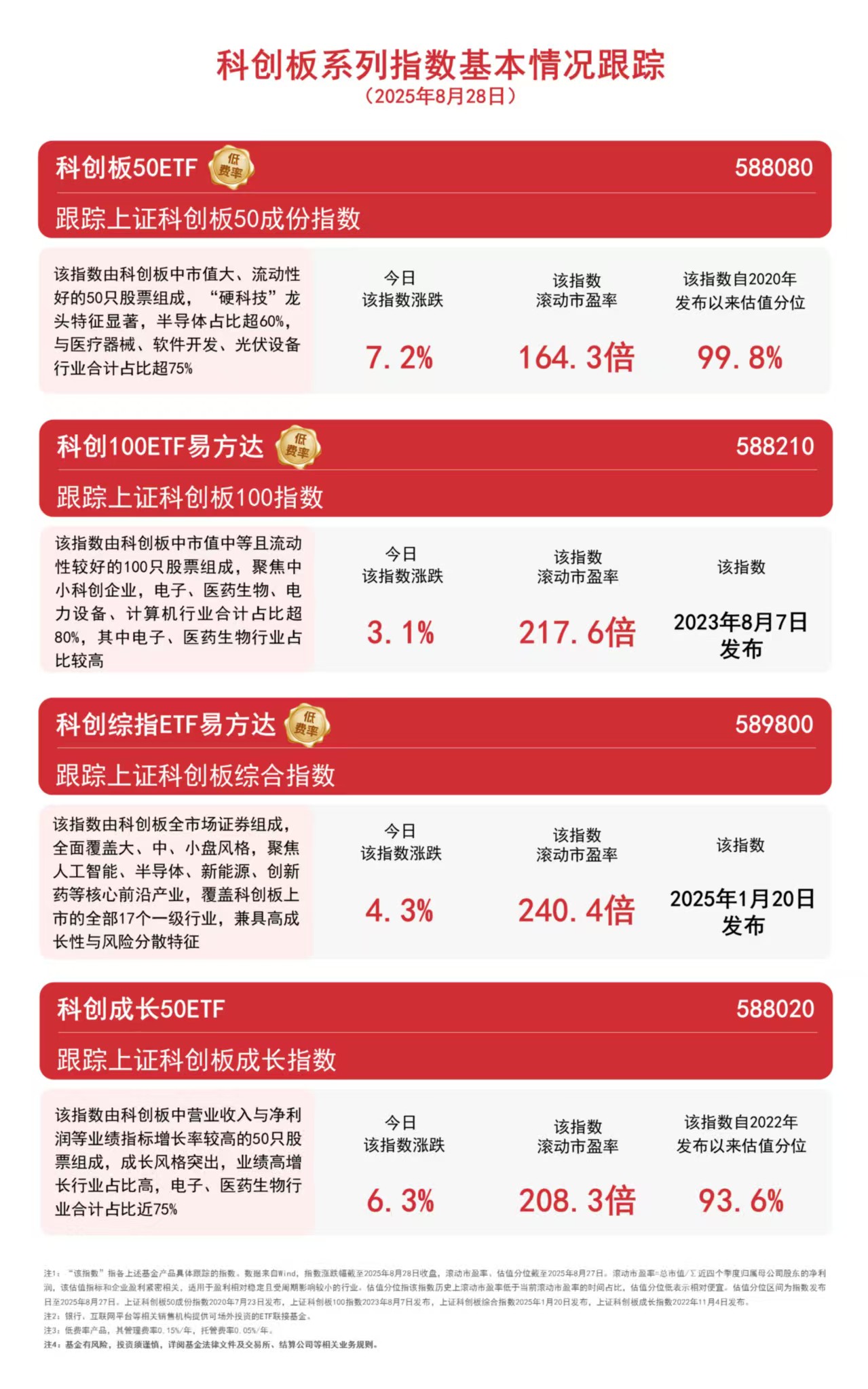 今日科技权重股表现强势,中芯国际、寒武纪股价双双创新高,相关指数午后短暂回落后开启单边拉升,截至收盘,上证科创板50成份指数上涨7.2%,上证科创板成长指数上涨6.3%,科创综指上涨4.3%,科创100指数上涨3.1%,科创板50ETF(588080)全天成交额超45亿元。