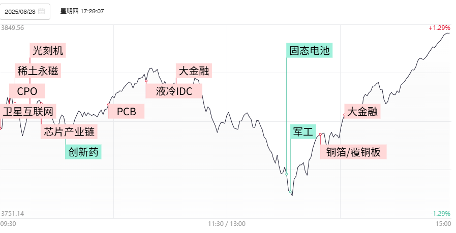 财联社8月29日电,市场午后V型反弹,三大指数全线收红,科创50指数涨超7%。个股涨多跌少,全市场超2800只个股上涨。沪深两市全天成交额2.97万亿,较前日缩量1948亿。1)英伟达发布的最新季度财报显示,其单季度营收和净利润均同比增长超50%,均超出市场预期。英伟达产业链持续得到资金聚焦,光模块方向的“易中天”三巨头,PCB产业链的胜宏科技,以及液冷服务器方向的英维克等核心品种均继续向上刷新历史高点。2)据TrendForce预测,2025年中国AI服务器市场中,本土芯片供应商占比有望提升至40%。半导体产业链全天大放异彩,两只科创芯片龙头寒武纪、中芯国际双双收涨超15%并再创历史新高,其中寒武纪收盘股价逼近1600元,超越贵州茅台登顶A股新股王。此外包括光刻机、端侧、存储芯片等分支同样表现不俗。午后随着算力硬件端热度再上台阶,包括东芯股份、屹唐股份、旋极信息等20厘米抱团小票午后也再度得到资金回流并继续加强。3)继此前氧化镨、氧化钕价格大涨后,氧化钬单日价格涨12500元/吨,重稀土概念股中国稀土迎来补涨并封住涨停,轻稀土龙头北方稀土以及金力永磁、大地熊等磁材股也维持强趋势。4)随着两市成交额连续第5日突破2.5万亿,大金融板块日内表现仍可圈可点,财富趋势收盘大涨逾10%,早盘一度跌超9%的指南针尾盘也拉升翻红,双双创出历史新高。不过券商方面总体表现仍不温不火,涨幅最大的信达证券也仅涨超6%。