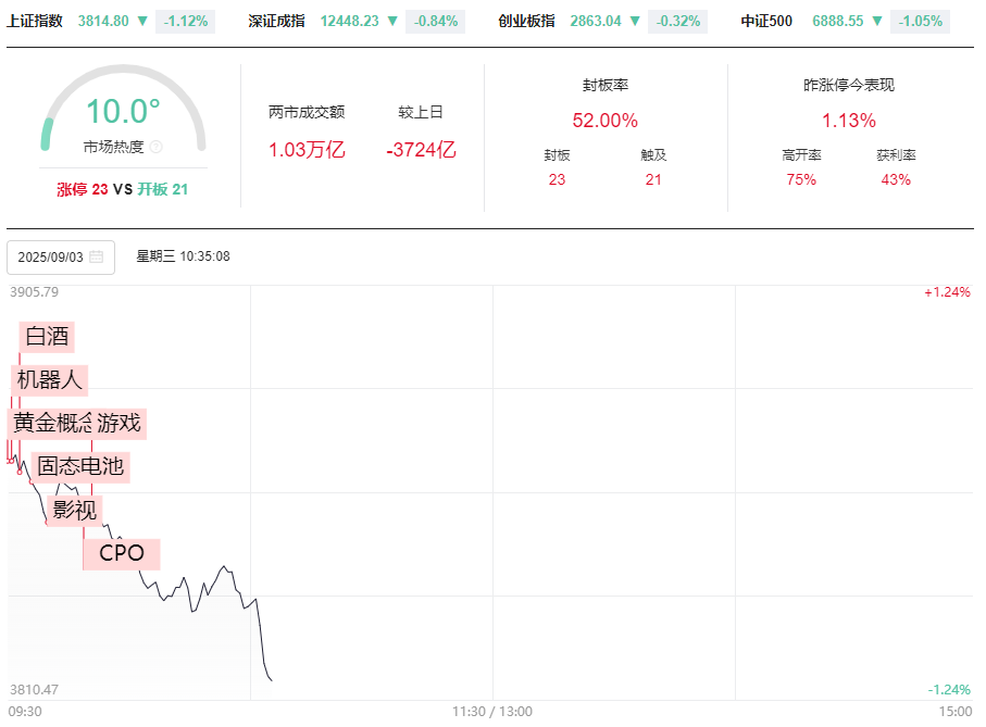 市场早盘震荡分化,三大指数涨跌不一。成交量方面,第一个小时两市缩量3813亿元。板块方面,早盘市场热点较为杂乱快速轮动,黄金、影视、固态电池、白酒等板块均有所活跃,此外部分算力股展开反弹,但所有热点强度均有限。
