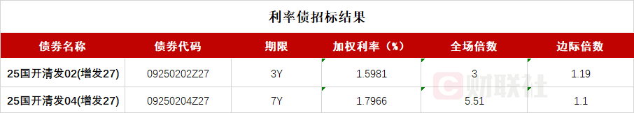 财联社9月4日电,从银行间市场获悉,国开行两期金融债已结束招标,其中:3年期品种中标收益率为1.5981%,全场倍数3,边际倍数1.19;7年期品种中标收益率1.7966%,全场倍数5.51,边际倍数1.1。
