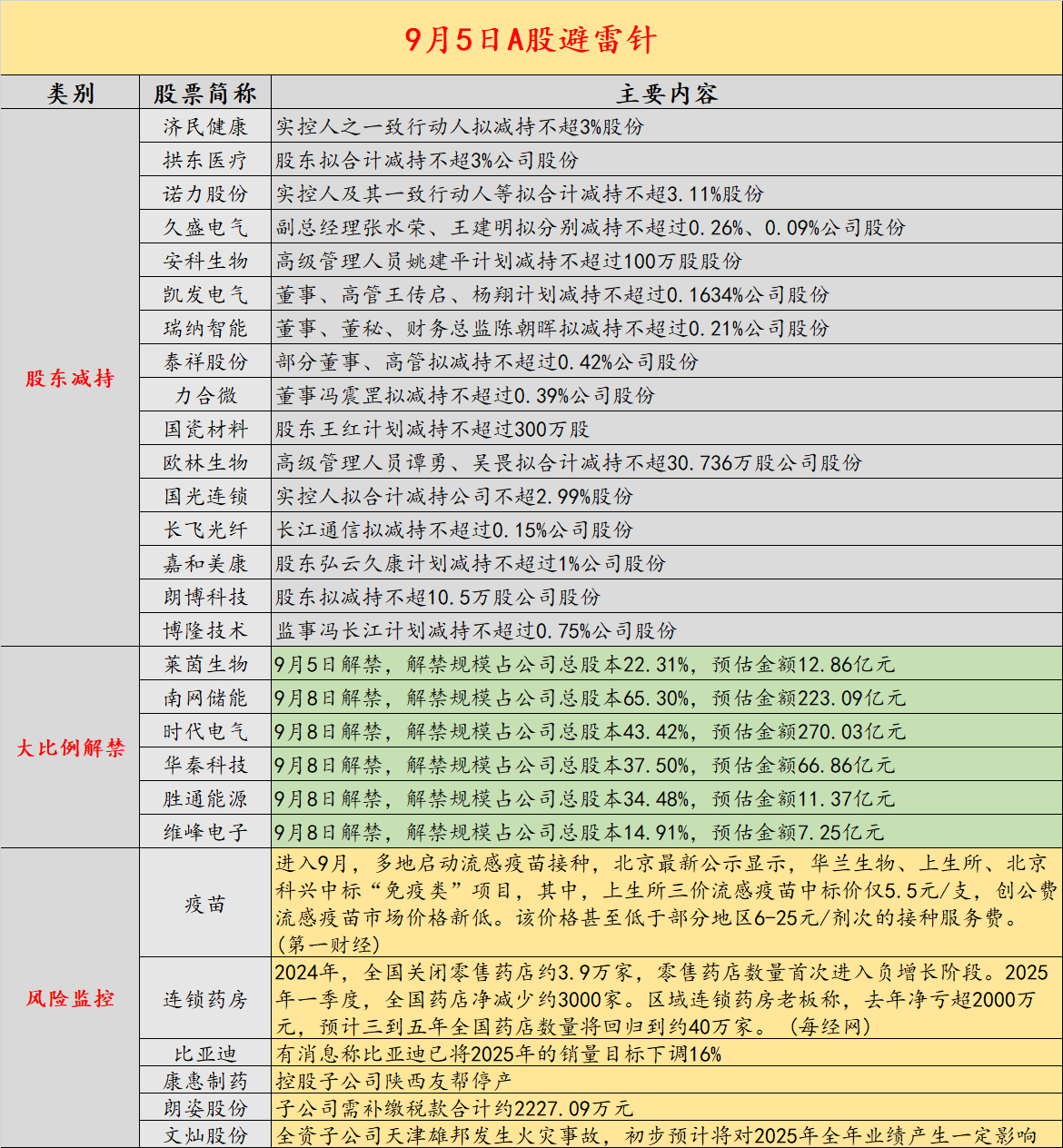 昨日公告的A股拟减持的公司数量较之前有所增多,济民健康实控人之一致行动人拟减持不超3%股份,诺力股份实控人及其一致行动人等拟合计减持不超3.11%股份;南网储能、莱茵生物将迎来超二成以上解禁;流感疫苗出现5.5元“冰点价”,今年以来价格多次探底;有消息称比亚迪已将2025年的销量目标下调16%;迷你版Labubu二手价普降,有款式跌近六成;康惠制药控股子公司陕西友帮停产;国际贵金属期货普遍收跌,COMEX黄金期货跌0.91%。