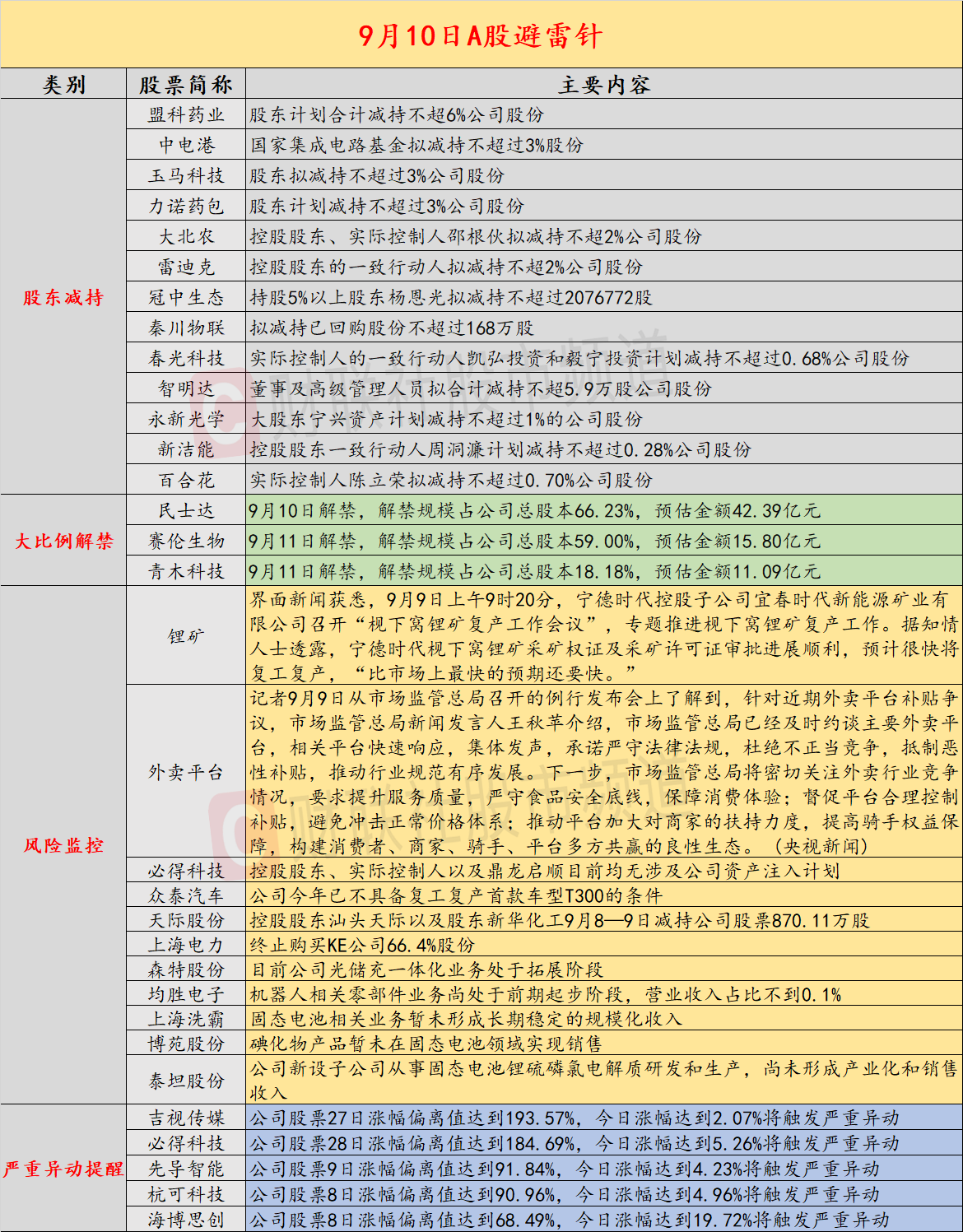 昨日公告的A股拟减持的公司数量较之前有所减少,盟科药业股东计划合计减持不超6%公司股份,中电港股东国家集成电路基金拟减持不超过3%股份;民士达、赛伦生物将迎来超五成以上解禁;宁德时代召开枧下窝锂矿复产会议,预计很快复产;3连板必得科技公告,控股股东、实际控制人以及鼎龙启顺目前均无涉及公司资产注入计划;市场监管总局已约谈主要外卖平台,抵制恶性补贴;2连板众泰汽车表示,公司今年已不具备复工复产首款车型T300的条件;以色列袭击卡塔尔的哈马斯高层。