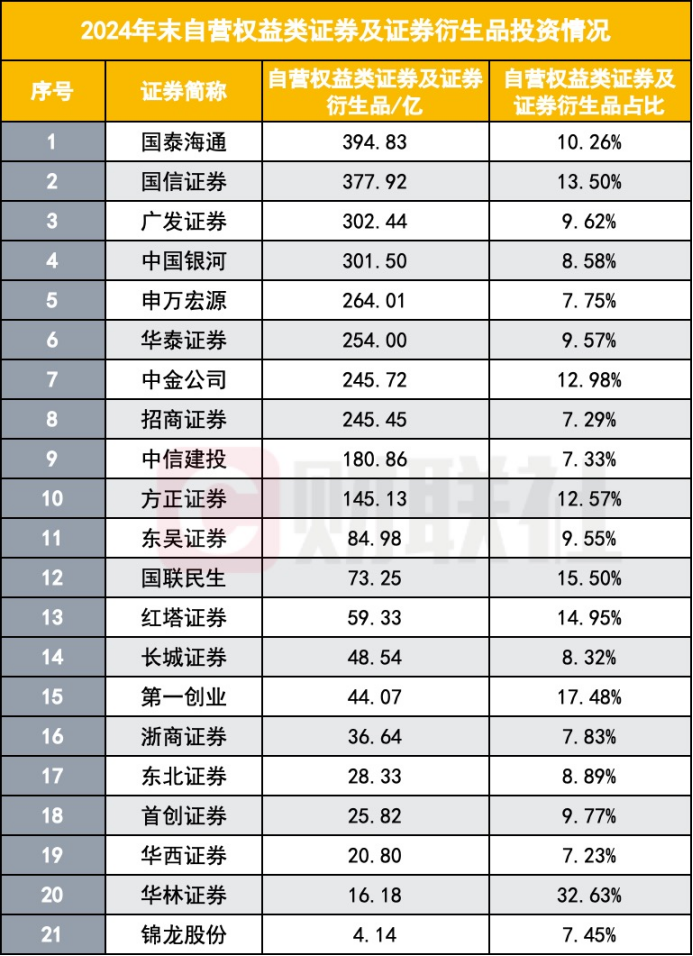 关于这一指标的情况,财联社近期在《这四大指标首次写进券商分类评价!基金投顾、权益类投资比重在列,扩围到前30》有过初步统计,其中,上市券商自营投资权益类资产规模占自营投资总规模的比例中位数为7.17%,在中位数之上的上市券商再按权益类资产规模排序,可以发现,排名靠前的主要还是以头部券商为主,方正证券挤进前十,东吴证券、国联民生、红塔证券等中小券商也可以获得0.5分的加分。