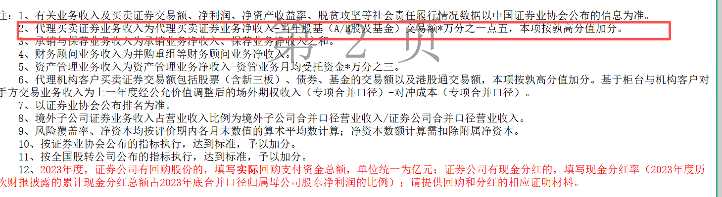 这次底稿变化中,有一项指标口径有所调整,受到行业热议。2024年底稿为“代理买卖证券业务收入为代理买卖证券业务净收入-当年股基(A/B股及基金)交易额*万分之一点五,本项按孰高分值加分。”到了2025年,这一部分有所调整,变为万一。