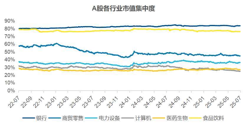 并且,由于银行有严格的准入门槛与较强的规模效应,银行业的格局也较为稳定,前几大银行的排名一般不会发生较大变化,近年来A股银行业的市值集中度也稳定在80%以上。