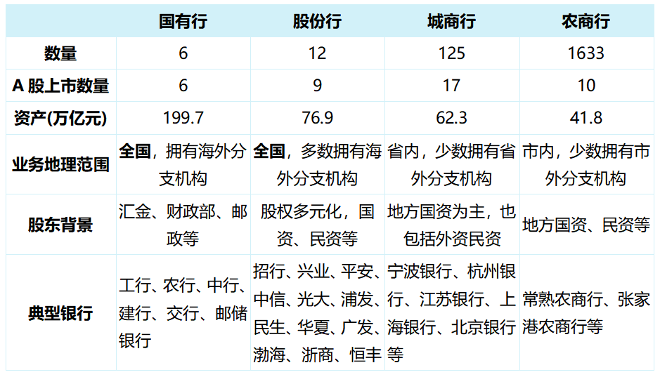 国有大行以工、农、中、建、交、邮储为代表,资产规模庞大、网点遍布全国,并承担服务国家战略等职能;