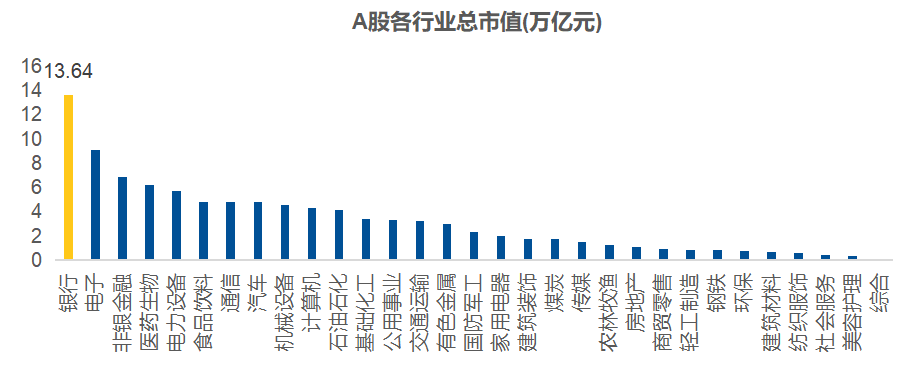 在股票市场当中,银行也是不容忽视的板块。以A股市场为例,截至2025年7月13日,银行业市值达13.64万亿元,占A股总市值的13.67%,在各行业中排名第一。