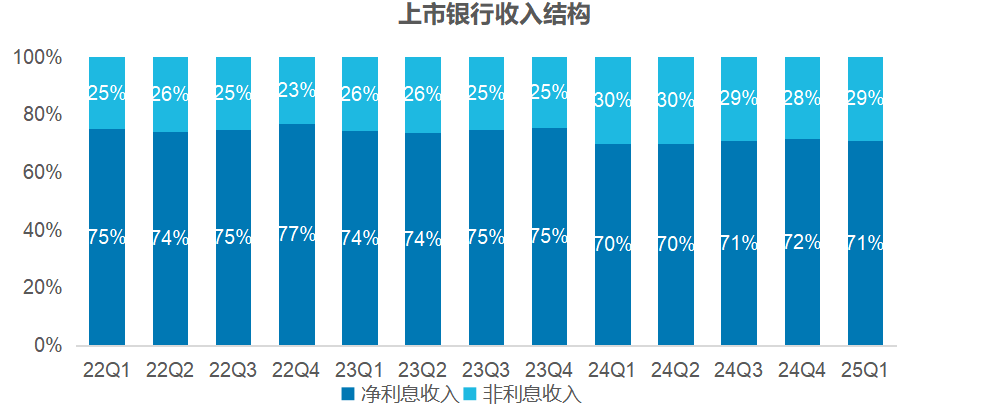 在实际运营中,资产业务与负债业务构成银行的两大核心业务,共同产生净利息收入;中间业务则作为补充,创造非利息净收入。在A股上市银行中,近年来净利息收入的占比始终高于70%。