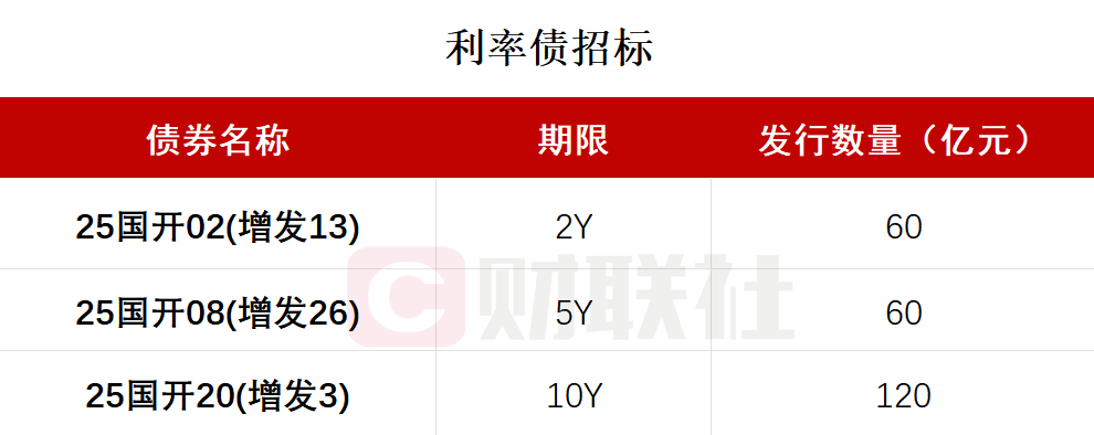 财联社9月16日电,按照此前公布的发行计划,国开行将于上午09:30-10:30招标发行三期金融债,分别为: 2025年第二期金融债券(第十三次增发),期限2年,发行量不超过60亿元,票面利率1.52%;2025年第八期金融债券(第二十六次增发),期限5年,发行量不超过60亿元,票面利率1.54%;2025年第二十期金融债券(第三次增发),期限10年,发行量不超过120亿元,票面利率1.87%。