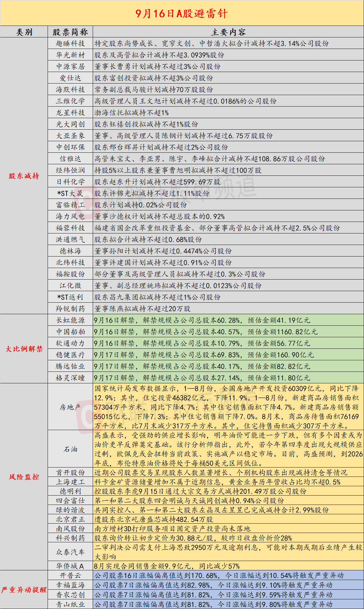 昨日公告的A股拟减持的公司数量较之前有所减少,趣睡科技特定股东尚势成长、宽窄文创、中哲潘火拟合计减持不超3.14%公司股份,华光新材股东及高管拟合计减持不超3.0939%股份;长虹能源、中国船舶将迎来超四成以上解禁;1—8月份全国房地产开发投资60309亿元,同比下降12.9%;9天8板首开股份公告,近期公司股票交易呈现股东人数显著增长、个别机构股东出现减持清仓等情况;iPhone 17系列价格已破发;2连板上海建工表示,科卡金矿资源储量增加不属于近期信息,黄金业务历年营收占比均不超0.5%;英伟达违反反垄断法,市场监管总局依法决定实施进一步调查。