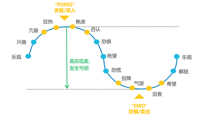 然而,在“线性思维”的驱动下,在周期的顶部,一些投资者的“FOMO”情绪往往最为强烈,认为市场还会上涨,机不可失,导致非理性的追高买入(这也是在牛市投资者反而更容易亏损的重要原因);而在周期的底部,一些投资者的“EMO”情绪也会到达顶点,沉浸在持续下跌的预期当中,导致非理性的卖出,最终“高买低卖”,发生亏损,如下图所示。
