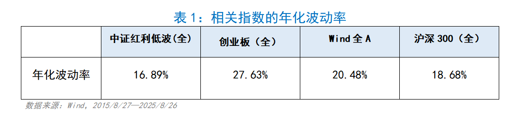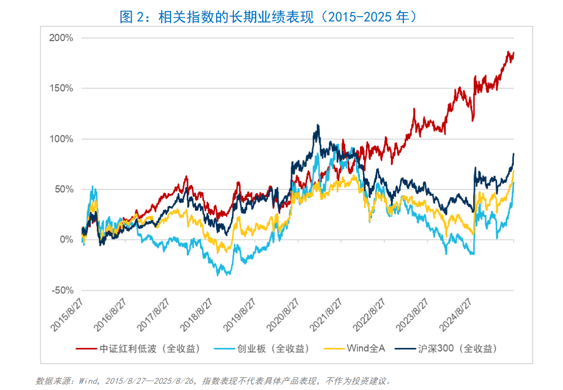 中证红利低波指数的年化波动率远低于创业板指数。但是,从近十年的业绩表现来看(见图2),中证红利低波指数的累计收益率为184%,却远超同期创业板指数55%的涨幅。