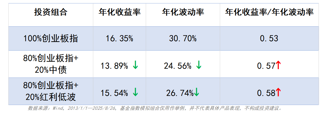 长期来看,在单一投资创业板指数的情况下,加入一定比例的低波动资产,年化收益率虽然略有下降,但是年化波动率却降低不少,尤其是投资性价比(年化收益率/年化波动率)均有上升。