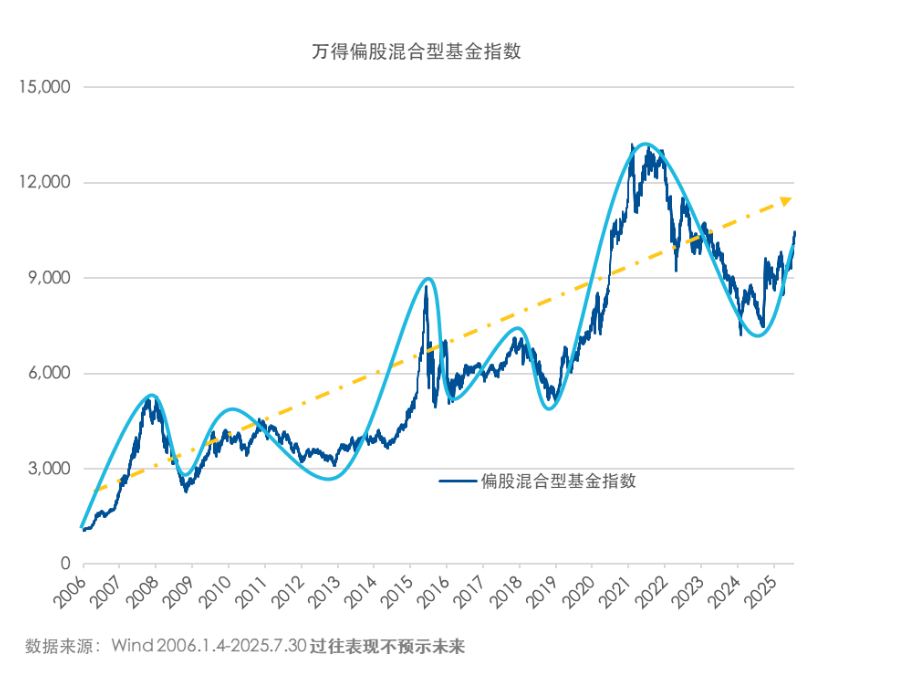 主要根植于股票市场的偏股型基金也呈现出近似的业绩走势规律。以万得偏股混合型基金指数为例,偏股型基金长期整体业绩呈现方向向上、周期波动的特征: