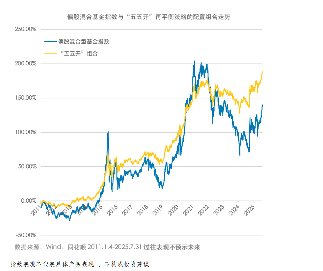 均对组合进行再平衡调整,恢复五五开比例,通过自2011年开始数据回测,可以发现,适时再平衡的股债平衡型组合,可以有效提升组合表现: