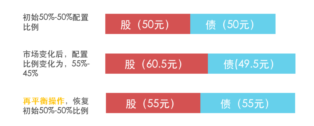 股票市场上涨后,股票资产的占比提升,达到设定的阈值,可以“卖掉”部分股票资产,完成“再平衡”,恢复到初始的5:5配置结构: