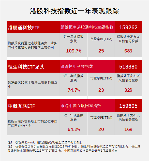 今日港股科技板块爆发,阿里、腾讯、小米、美团等大型科技股集体大涨,带动相关ETF走强。截至ETF收盘,恒生科技ETF龙头(513380)收涨4.01%,单日成交额超9亿元,中概互联ETF(159605)、港股通科技ETF(159262)分别涨3.98%、3.81%,均居全市场ETF涨幅TOP25。截至9月16日,三只产品最新规模分别超83、49、41亿元。