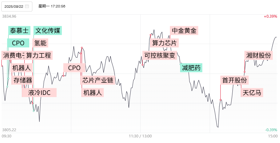 财联社9月23日电,市场全天震荡拉升,三大指数均收涨。在芯片概念股的带领下,科创50指数盘中一度涨逾4%。沪深两市成交额2.12万亿,较上周五缩量2023亿。1)据报道,OpenAI已与立讯精密签署协议,共同打造一款消费级设备。受此消息提振,立讯精密跳空向上封T字涨停,总市值突破4400亿元,进而带动消费电子板块集体爆发,长盈精密、国光电器等多股涨停或涨超10%。在端侧硬件的爆发式增长预期提振下,ASIC芯片为首的端侧硬件端也全线爆发,芯原股份一度触及20cm涨停并创出历史新高。2)上交所官网显示,国产GPU芯片龙头摩尔线程科创板IPO将于9月26日上会,该消息刺激多只直接或间接参股摩尔线程股权的相关个股爆发,初灵信息、和而泰、宏力达、东华软件等多股报收涨停。随着摩尔线程概念的集体爆发,整个国产算力产业链人气被再度点燃,海光信息、中芯国际等权重龙头股日内再创历史新高,上周火热的光刻机概念也卷土重来,张江高科日内一度触及涨停同样创出历史新高。3)近期机器人产业链热度居高不下,宇树科技相关概念股人气火爆,首开股份反包涨停走出14天12板,旗下参股公司深创投持有宇树科技股份的大众公用AH股双双爆发,前者早早封于涨停,后者更是日内一度飙升47%。4)现货黄金价格日内突破3720美元,Comex白银期货主力合约一度站上44美元一线。午后整个贵金属板块加速上扬,白银股盛达资源、湖南白银涨停,兴业银锡涨超6%再创历史新高。