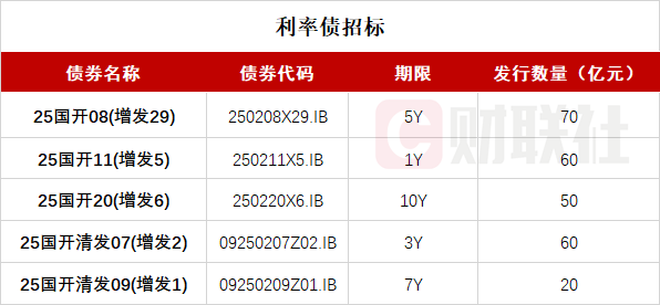 财联社9月25日电,按照此前公布的发行计划,国家开发银行将于09:30-10:30、14:30-15:30分别招标发行五期金融债:国家开发银行2025年第十一期金融债券(第五次增发),期限1年,发行量不超过60亿元,票面利率1.53%;国家开发银行2025年在上海清算所第七期金融债券(第二次增发),期限3年,发行量不超过60亿元,票面利率1.79%;国家开发银行2025年第八期金融债券(第二十九次增发),期限5年,发行量不超过70亿元,票面利率1.54%;国家开发银行2025年在上海清算所第九期金融债券(第一次增发),期限7年,发行量不超过20亿元,票面利率1.95%;国家开发银行2025年第二十期金融债券(第六次增发),期限10年,发行量不超过50亿元,票面利率1.87%。