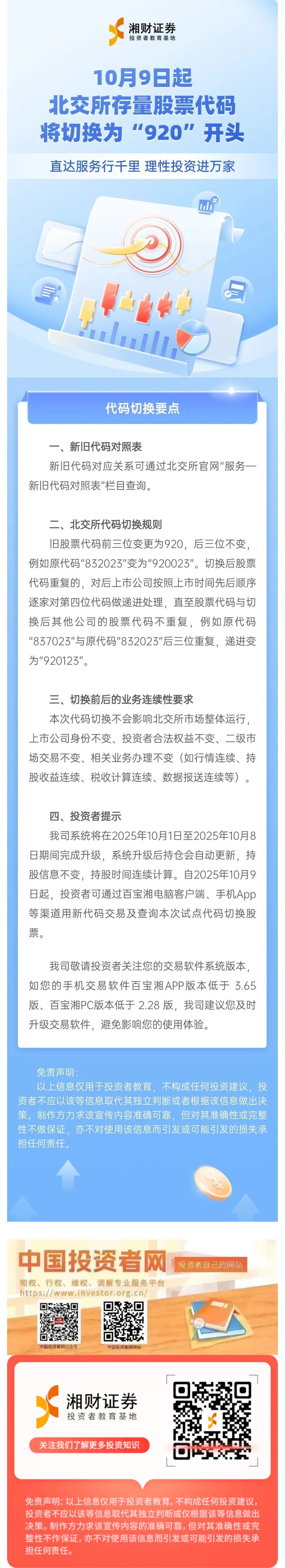 【理性投资进万家 | 小湘科普】10月9日起北交所存量股票代码将切换为“920”开头