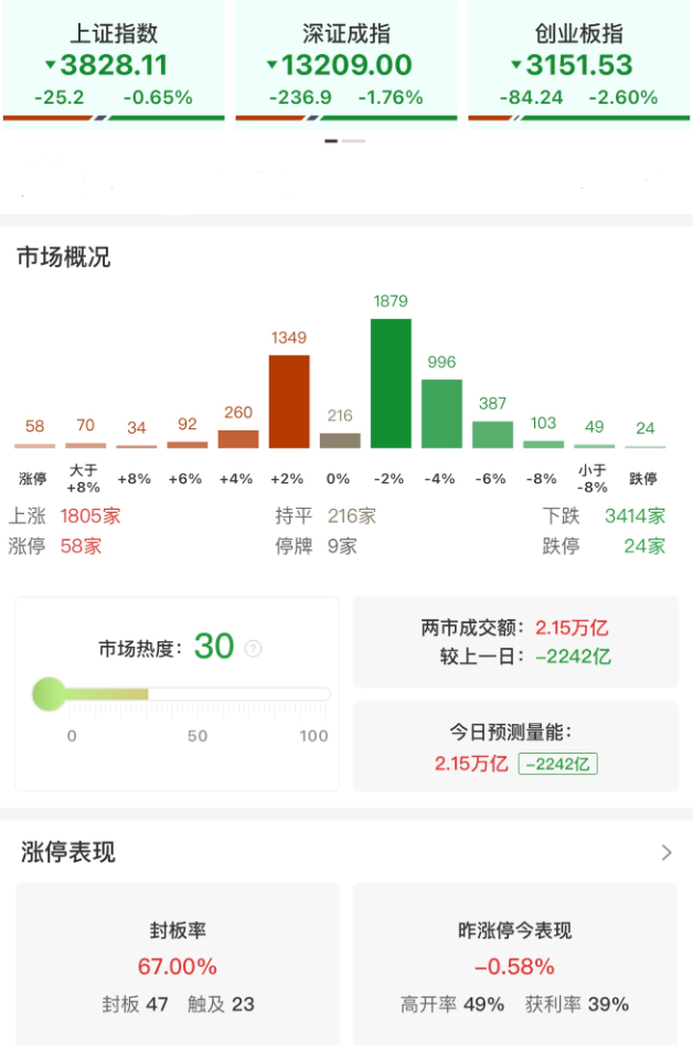 财联社9月26日电,市场全天震荡调整,创业板指盘中跌超2.5%。沪深两市成交额2.15万亿,较上一个交易日缩量2242亿。盘面上,市场热点较为杂乱,题材强度一般,全市场超3400只个股下跌。从板块来看,风电板块走强,吉鑫科技晋级2连板,威力传动20cm涨停。半导体板块内出现分歧,华虹公司逆势大涨创历史新高,但立昂微、凯美特气双双跌停。有色金属方向表现活跃,精艺股份成功晋级3连板。下跌方面,游戏板块集体下跌,吉比特跌停。算力硬件股走弱,青山纸业跌停。板块方面,风电、保险等板块涨幅居前,游戏、算力硬件、光刻机等板块跌幅居前。截至收盘,沪指跌0.65%,深成指跌1.76%,创业板指跌2.60%。