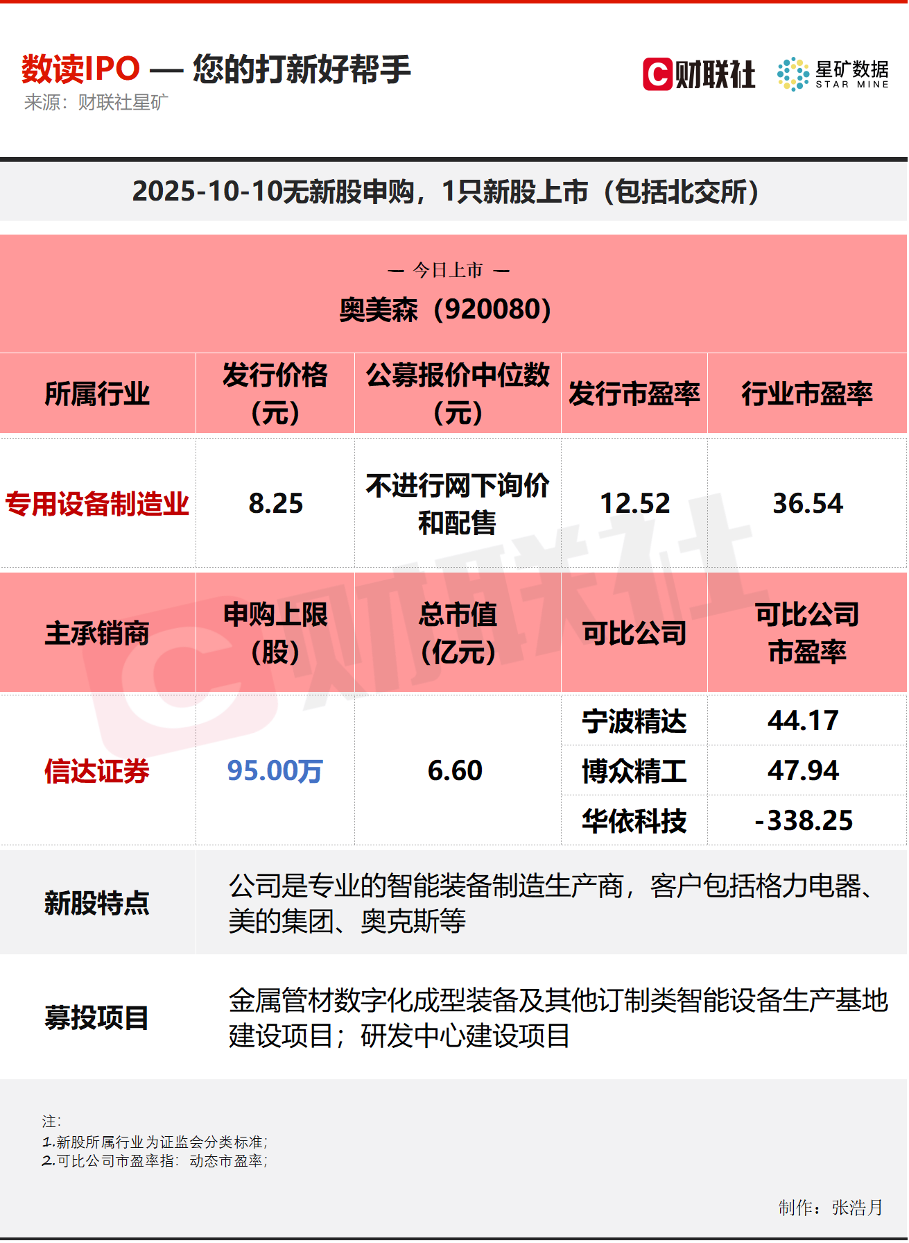 财联社10月10日电,今日无新股申购;有1只新股上市,为北交所的奥美森。奥美森是专业的智能装备制造生产商。