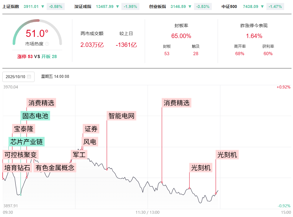 市场午后继续震荡调整,创业板指领跌。成交量方面,第一个小时两市缩量648亿,预计两市全天成交2.53万亿。题材分化轮动,光刻机概念股逆势上涨,凯美特气、新莱应材双双涨停,大消费方向表现活跃,遥望科技、依依股份午后快速涨停。贵金属概念持续回落,西部黄金、晓程科技跌9%。短线方面,短线情绪低迷,连板股晋级率仅为10%,连续两日大幅降低。连板高度仅为3连板,冠中生态、江西铜业炸板回落,振德医疗反复开板。