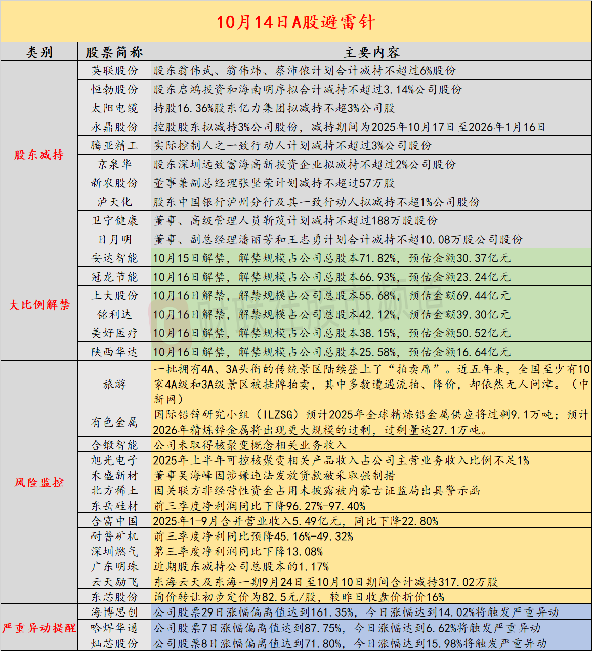 昨日公告的A股拟减持的公司数量较之前有所减少,英联股份股东翁伟武、翁伟炜、蔡沛侬计划合计减持不超过6%股份,恒勃股份股东启鸿投资和海南明序拟合计减持不超过3.14%公司股份;安达智能、冠龙节能将迎来超六成以上解禁;国内期货主力合约多数下跌;10天6板合锻智能公告,公司未取得核聚变概念相关业务收入;多位公募基金分析人士认为,四季度通常会进入防御策略阶段;3天2板旭光电子提示风险,2025年上半年可控核聚变相关产品收入占公司主营业务收入比例不足1%;交通运输部发布对美船舶收取船舶特别港务费实施办法。