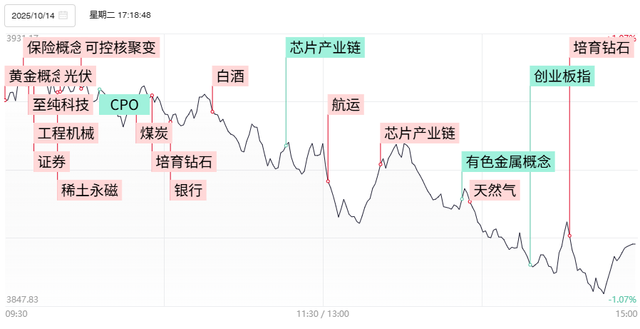 财联社10月15日电,上个交易日市场全天震荡调整,创业板指、科创50指数盘中双双跌超4%。沪深两市成交额2.58万亿,较前日放量2215亿。1)国际原子能机构第30届聚变能大会开幕,尽管板块人气龙头合锻智能盘中遭遇炸板分歧未能晋级5连板,使得板块内大部分后排股遭遇深幅调整,但另一只连板股安泰科技仍实现晋级4连板,叠加三季报预增的楚江新材也全天封死一字涨停。2)据中证报报道,相关主管部门或将发布一份加强光伏产能调控的文件,文件内容涉及对全产业链现有产能开工率限制方面的要求,并严禁新增产能。光伏产业链早盘大幅冲高,隆基绿能、晶澳科技、爱旭股份等多股触及涨停。3)交通运输部宣布,将启动航运业、造船业及相关产业链供应链安全和发展利益受影响情况调查,此外商务部发布商务部令,对韩华海洋株式会社5家美国相关子公司采取反制措施。航运、船舶板块午后逆势走强,南京港走出2连板,华光源海、宁波海运、中远海控等涨幅靠前。4)美团平台数据显示,今年双节期间白酒销量同比激增8倍。此外近期知名投资人段永平在雪球社区发言称,再次发声"买了点茅台"。白酒板块全天逆势活跃,会稽山涨停,酒鬼酒、舍得酒业、泸州老窖、贵州茅台等不同程度收涨,此外零售股国光连锁连续2日录得涨停。
