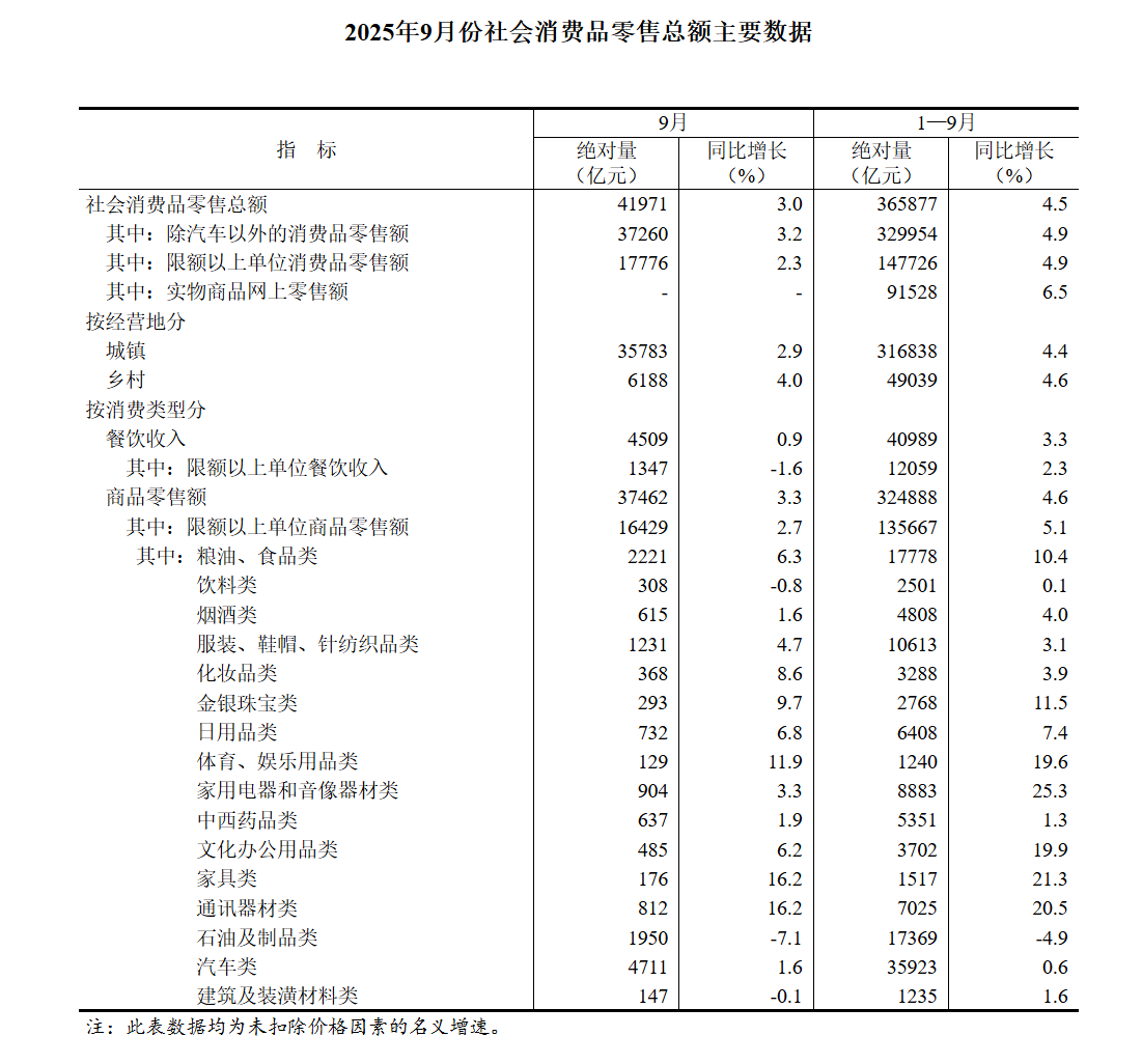 国家统计局:9月份社会消费品零售总额41971亿元 同比增长3.0%