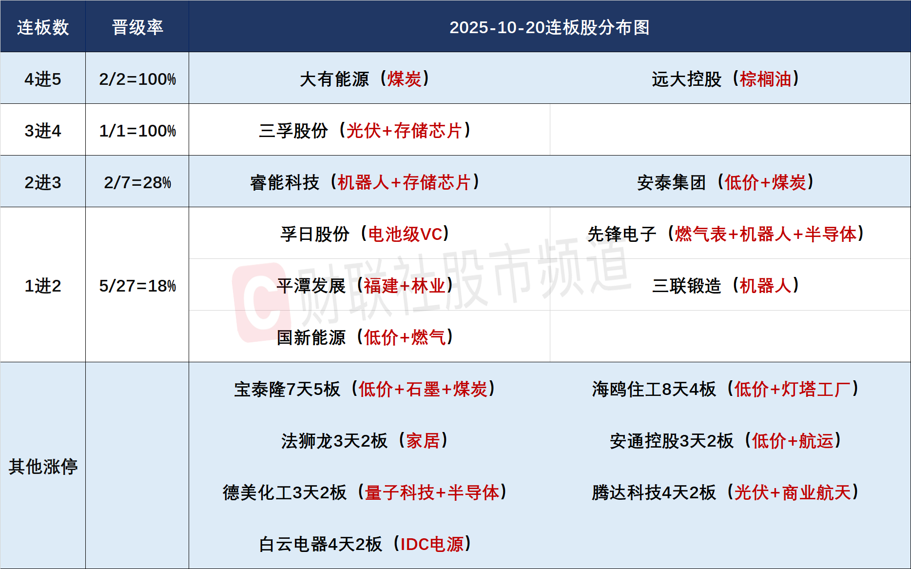 今日共76股涨停,连板股总数10只,其中三连板及以上个股5只,上一交易日共10只连板股,连板股晋级率50%(不含ST股、退市股)。个股方面,全市场超4000只个股上涨,近百股涨停或涨逾10%。连板股表现回暖,上个交易日三连板及以上个股全部晋级,远大控股、大有能源晋级5连板,继续向上拓展连板高度。此外,宝泰隆、德美化工、法狮龙等走出反包涨停。板块方面,寒潮概念表现活跃,煤炭、燃气、热电等细分涨幅居前,其中煤炭股大有能源11天7板、宝泰隆7天5板,燃气股国新能源5天4板;超硬材料概念午后大涨,北交所惠丰钻石30CM涨停,四方达20CM涨停,黄河旋风、恒盛能源涨停,力量钻石涨超10%。