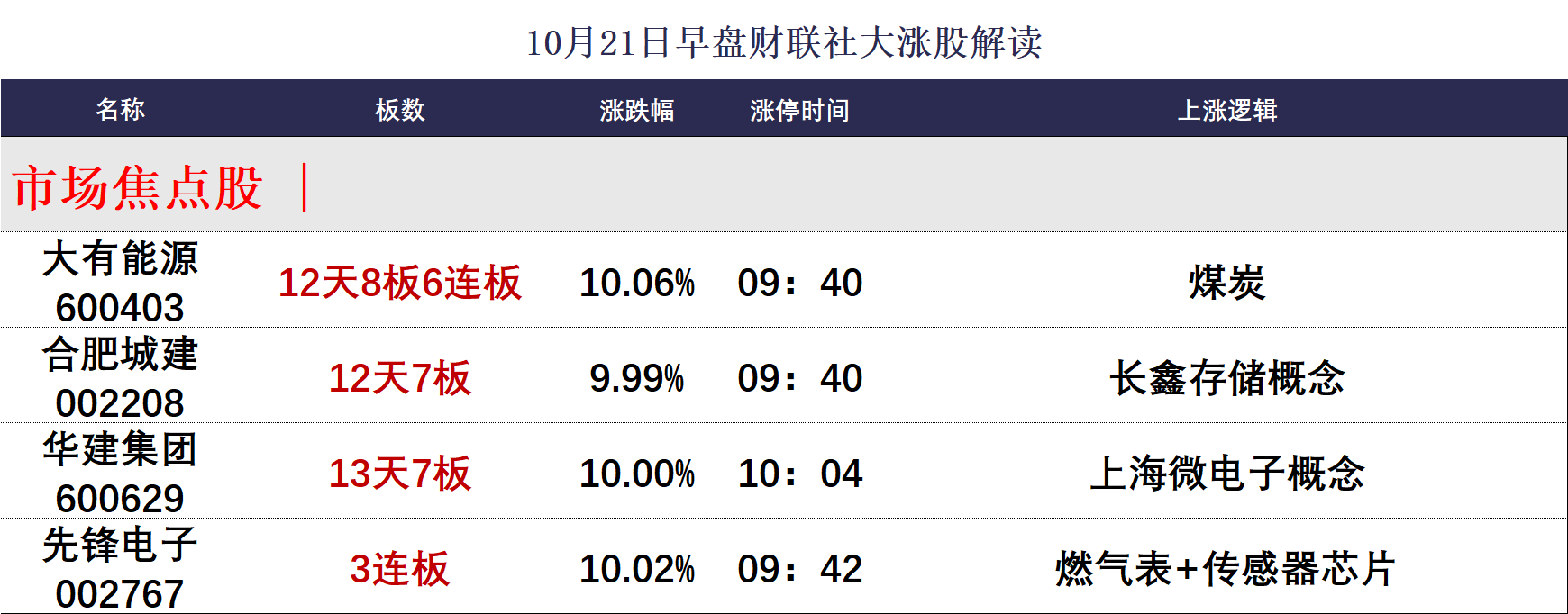 财联社10月21日电,今日午盘全市场共60股涨停,连板股总数12只,10股封板未遂,封板率为86%(不含ST股、退市股)。焦点股方面,大有能源晋级6连板,长鑫存储概念股合肥城建12天7板,上海微电子概念华建集团13天7板。