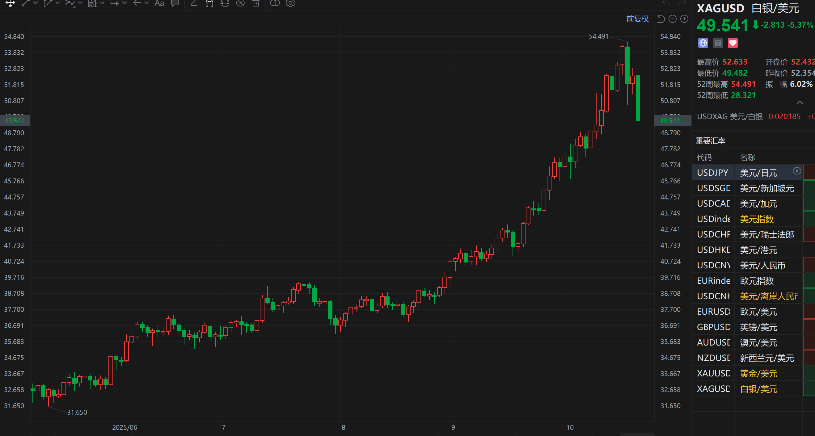 财联社10月21日电,现货白银跌4.99%,报49.67美元/盎司。现货白银于10月17日创下54.49美元/盎司的历史最高价。现货黄金跌2.05%,报4267.08美元/盎司。