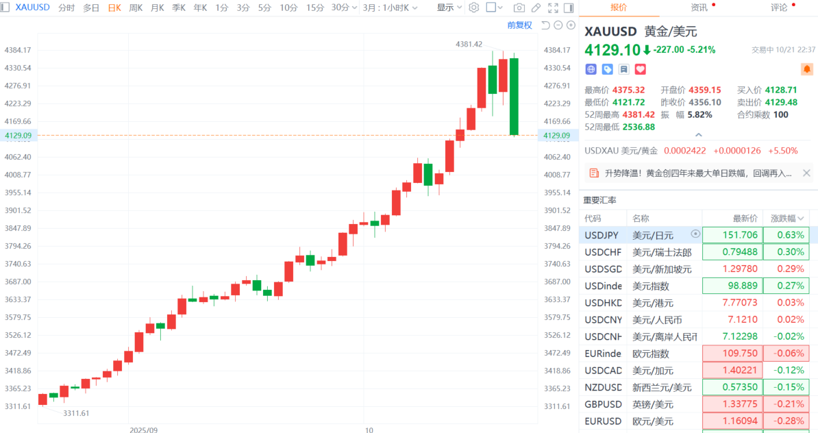 财联社10月21日电,现货黄金一度下跌5.4%,创2020年8月以来最大跌幅。