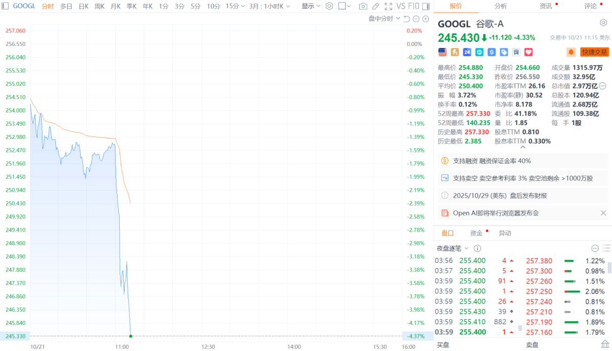财联社10月21日电,谷歌日内跌幅扩大至4%,现报245.7美元,Open AI发布视频显示即将(于太平洋时间10:00 am)举行浏览器发布会。