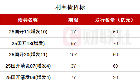 财联社10月23日电,按照此前公布的发行计划,国家开发银行将于09:30-10:30、14:30-15:30分别招标发行五期金融债:国家开发银行2025年第十一期金融债券(第十次增发),期限1年,发行量不超过60亿元,票面利率1.53%;国家开发银行2025年在上海清算所第七期金融债券(第四次增发),期限3年,发行量不超过60亿元,票面利率1.79%;国家开发银行2025年第十八期金融债券(第一次增发),期限5年,发行量不超过70亿元,票面利率1.79%;国家开发银行2025年在上海清算所第九期金融债券(第四次增发),期限7年,发行量不超过20亿元,票面利率1.95%;国家开发银行2025年第二十期金融债券(第十一次增发),期限10年,发行量不超过50亿元,票面利率1.87%。