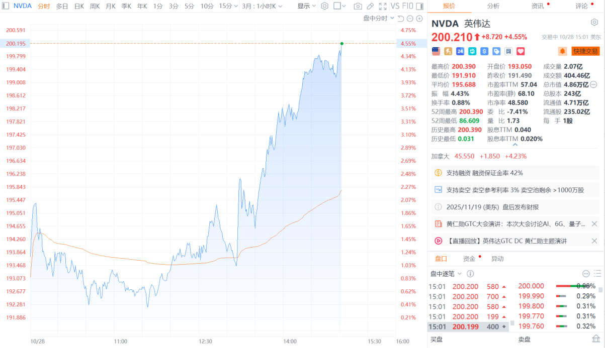 财联社10月29日电,英伟达股价触及200美元关口,再创历史新高,盘中涨4.55%,总市值达4.86万亿美元。消息面上,英伟达在GTC活动中推出全新BlueField-4处理器等多项产品,同时黄仁勋宣布英伟达与Palantir等多家公司达成合作。