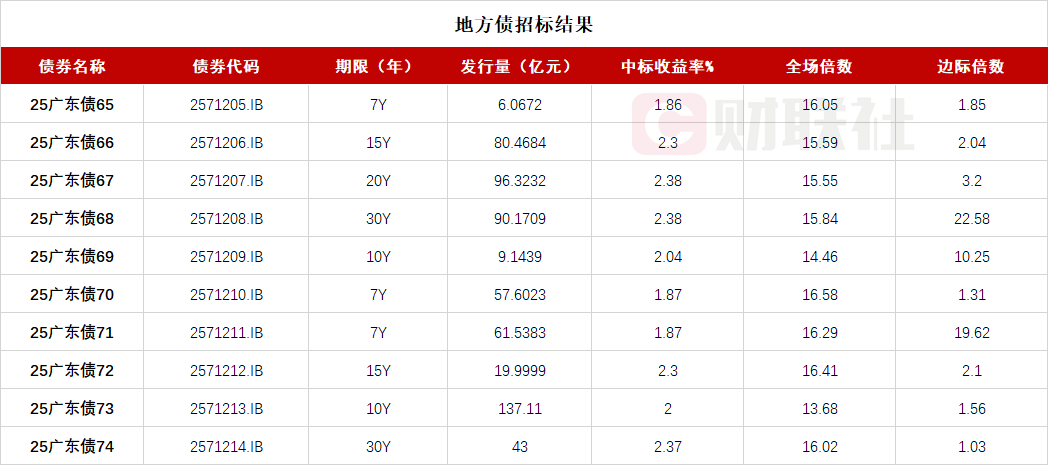 财联社10月29电,广东省政府十期地方债已招标结束,投标倍数均在13倍之上,具体中标信息如下: