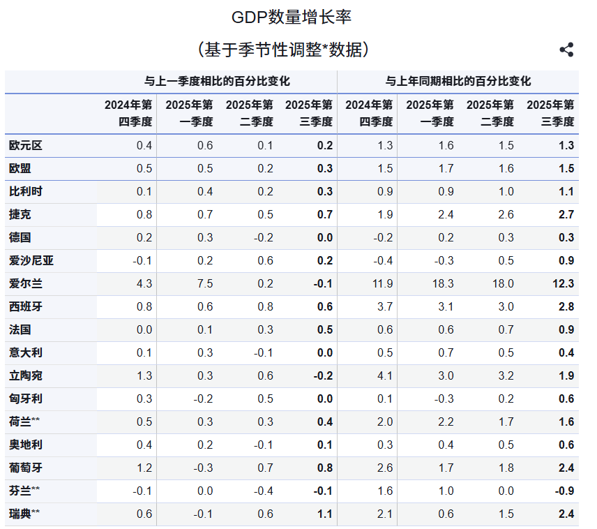 财联社10月30日电,欧元区第三季度经济同比增长1.3%,预期为1.2%。