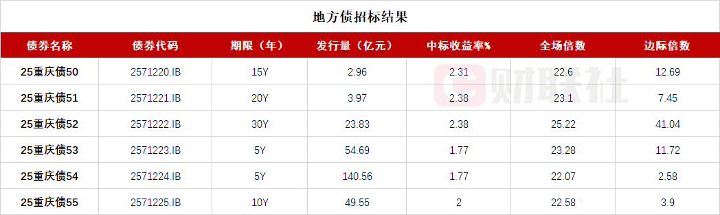 财联社10月31日电,重庆市政府六期地方债已招标结束,投标倍数均在22倍之上,具体中标信息如下: