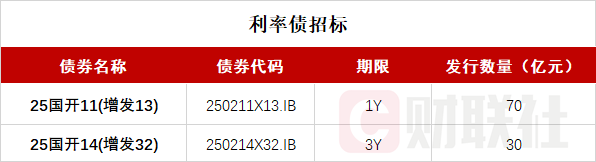 财联社11月3日电,按照此前公布的发行计划,国家开发银行将于14:30-15:30招标发行两期金融债:国家开发银行2025年第十一期金融债券(第十三次增发),期限1Y,发行量不超过70亿元,票面利率1.53%;国家开发银行2025年第十四期金融债券(第三十二次增发),期限3Y,发行量不超过30亿元,票面利率1.42%。