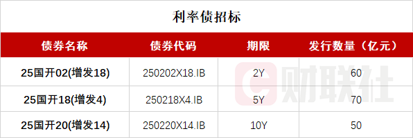 财联社11月4日电,按照此前公布的发行计划,国家开发银行将于09:30-10:30招标发行三期金融债:国家开发银行2025年第二期金融债券(第十八次增发),期限2年,发行量不超过60亿元,票面利率1.52%;国家开发银行2025年第十八期金融债券(第四次增发),期限5年,发行量不超过70亿元,票面利率1.79%;国家开发银行2025年第二十期金融债券(第十四次增发),期限10年,发行量不超过50亿元,票面利率1.87%。