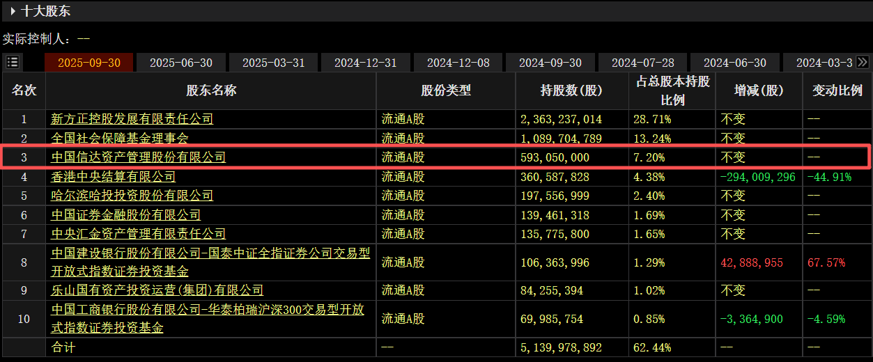 小财注:中国信达控股股东为中华人民共和国财政部。截至三季度末,中国信达位列方正证券第三大股东,持股5.93亿股,占公司总股本的7.2%。