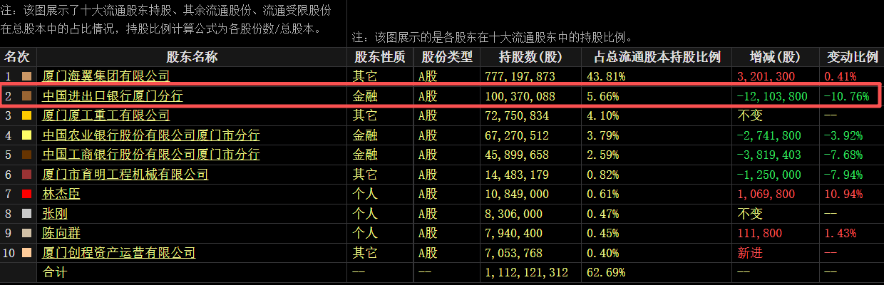 小财注:截至三季度末,中国进出口银行厦门分行位列厦工股份第二大流通股股东,持股1亿股,占公司总股本5.66%。