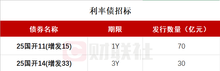 财联社11月10日电,按照此前公布的发行计划,国家开发银行将于下午14:30-15:30招标发行两期金融债,分别为: 2025年第十一期金融债券(第十五次增发),期限1年,发行量不超过70亿元,票面利率1.53%; 2025年第十四期金融债券(第三十三次增发),期限3年,发行量不超过30亿元,票面利率1.42%。
