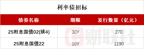 财联社11月14日电,按照此前公布的发行计划,财政部将于上午10:35-11:35招标发行两期国债,分别为:2025年记账式附息(二十二期)国债,期限10Y,发行量不超过1190亿元;2025年记账式附息(二期)国债(第四次续发),期限30Y,发行量不超过270亿元,票面利率1.92%。